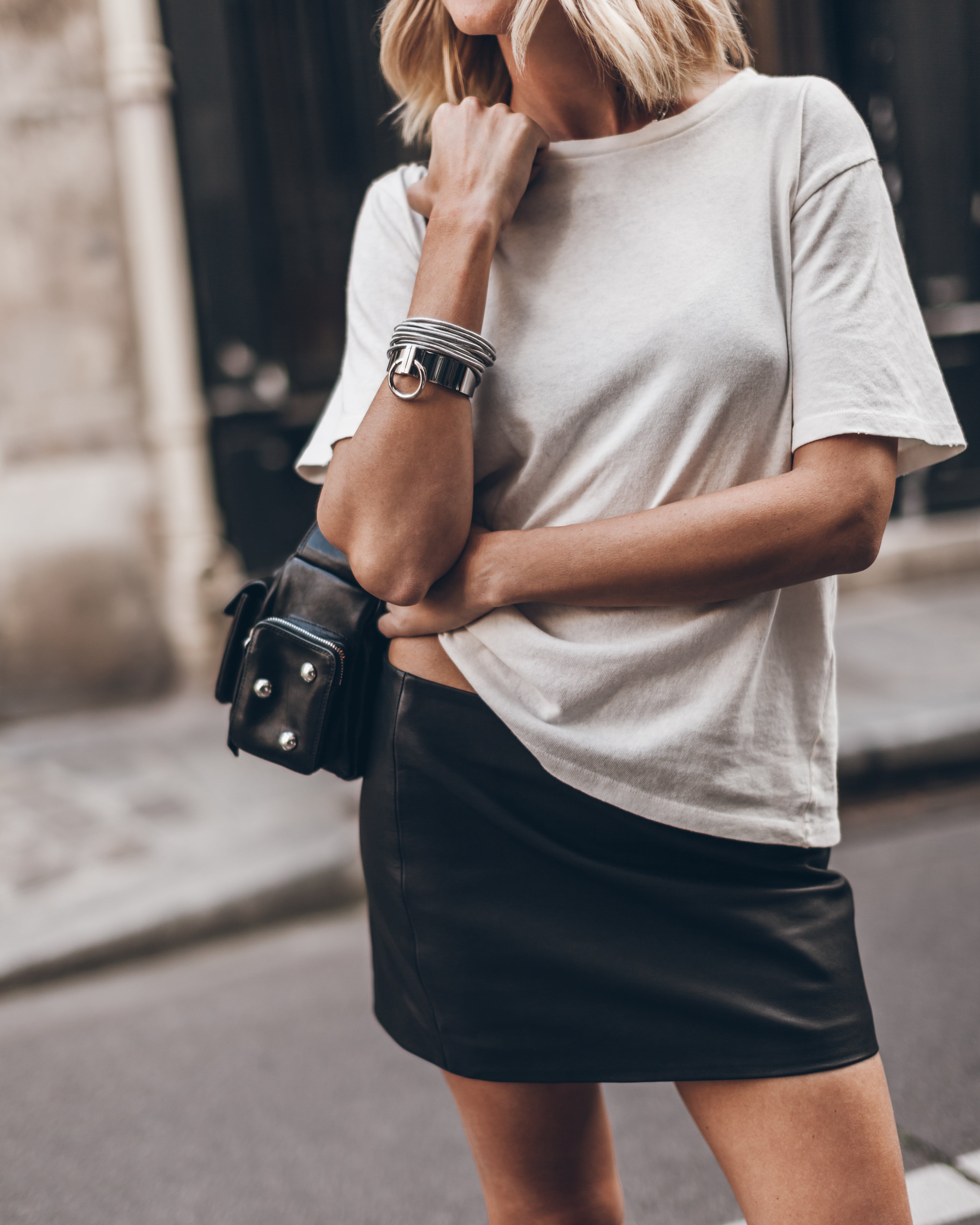Schwarzer Minirock aus Leder mit nahtloser Vorderseite und verdecktem Seitenreißverschluss.