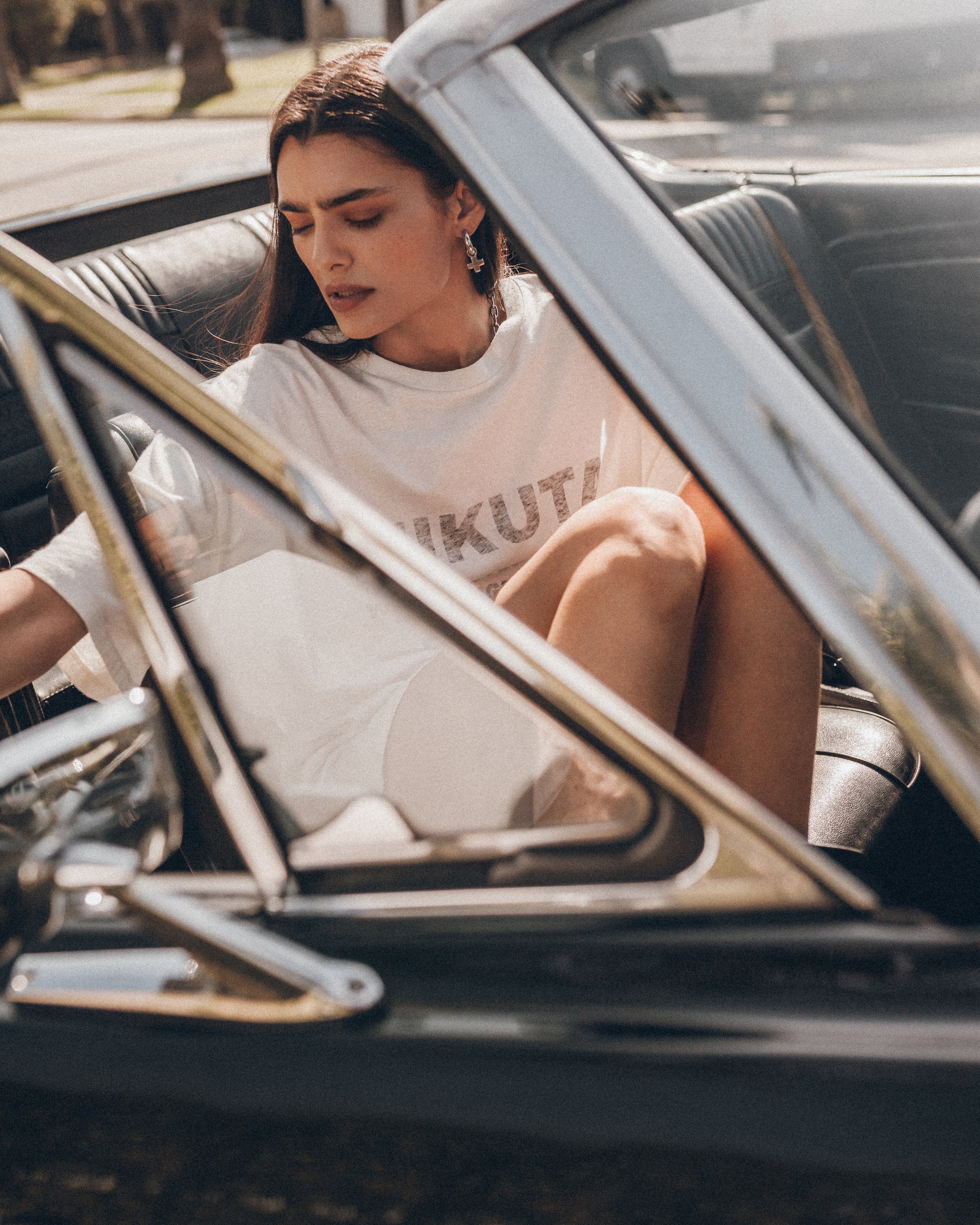 Entspannt mit einem Hauch von Romantik, unsere Signature Oversized-Silhouette kehrt zurück. Das White Oversized Mikuta T-Shirt hat leicht überschnittene Ärmel, die bis zum Ellenbogen reichen, und einen Saum, der locker unter die Taille fällt – mühelos, atmungsaktiv und vielseitig tragbar. Gefertigt aus einem natürlichen Baumwoll- und Hanf-Mix ist der individuelle Print von klassischen Tour-Shirts und unserem Westcoast-Roadtrip-Shooting für die Spring 2026 Kollektion inspiriert.