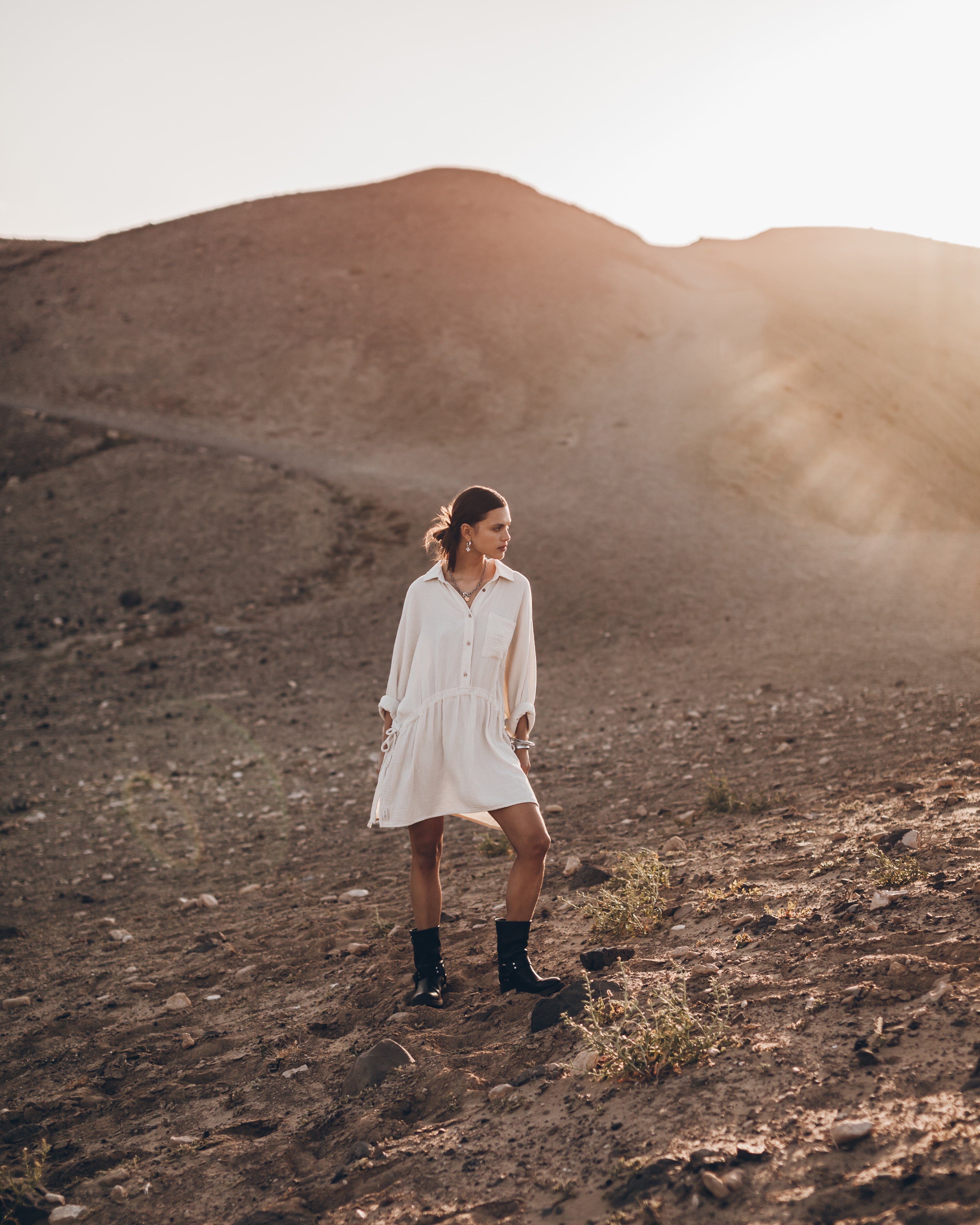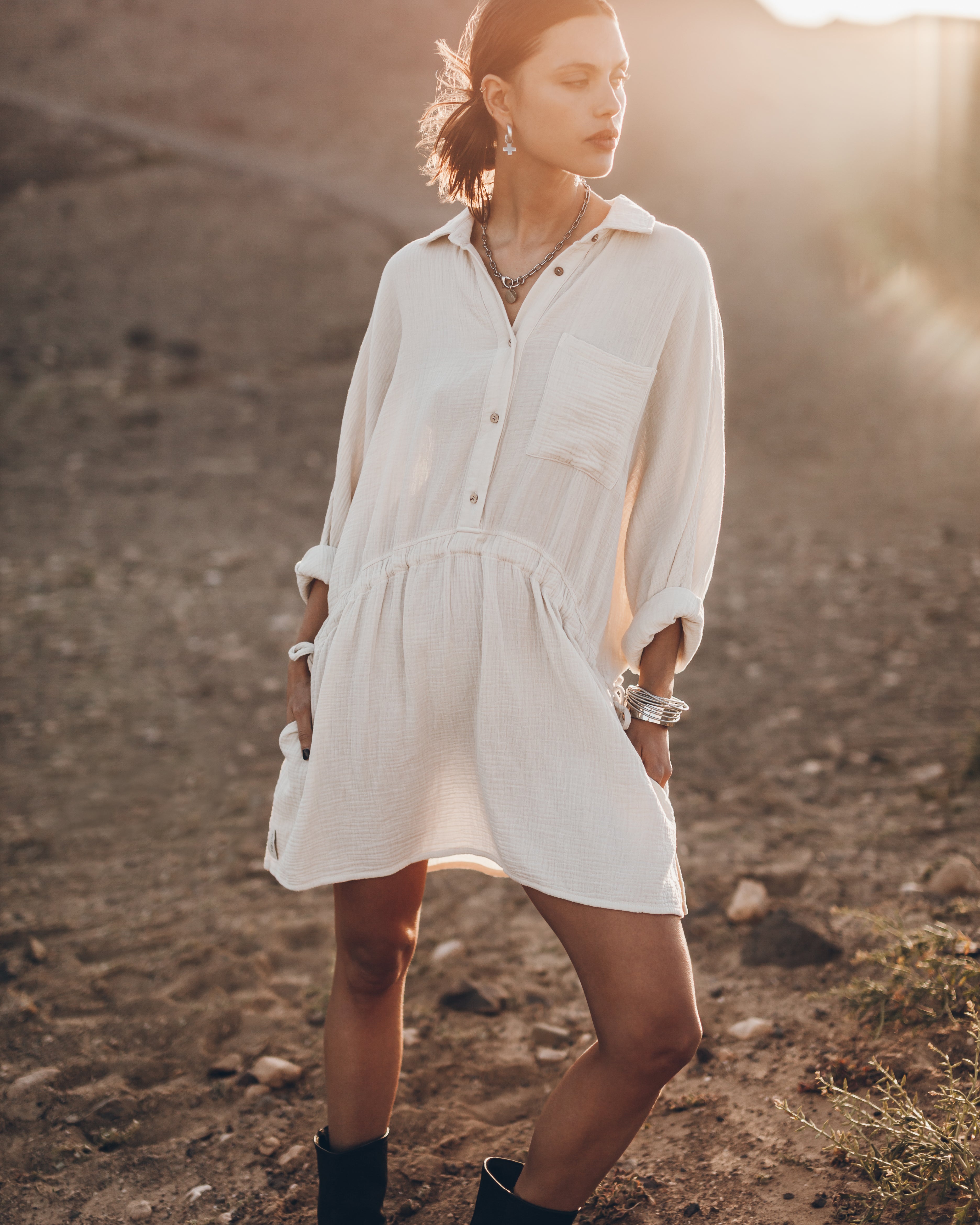 Oversized Hemdblusenkleid aus Baumwolle in Hellgrau/Beige mit verstellbaren Bändern für vielseitige Looks.