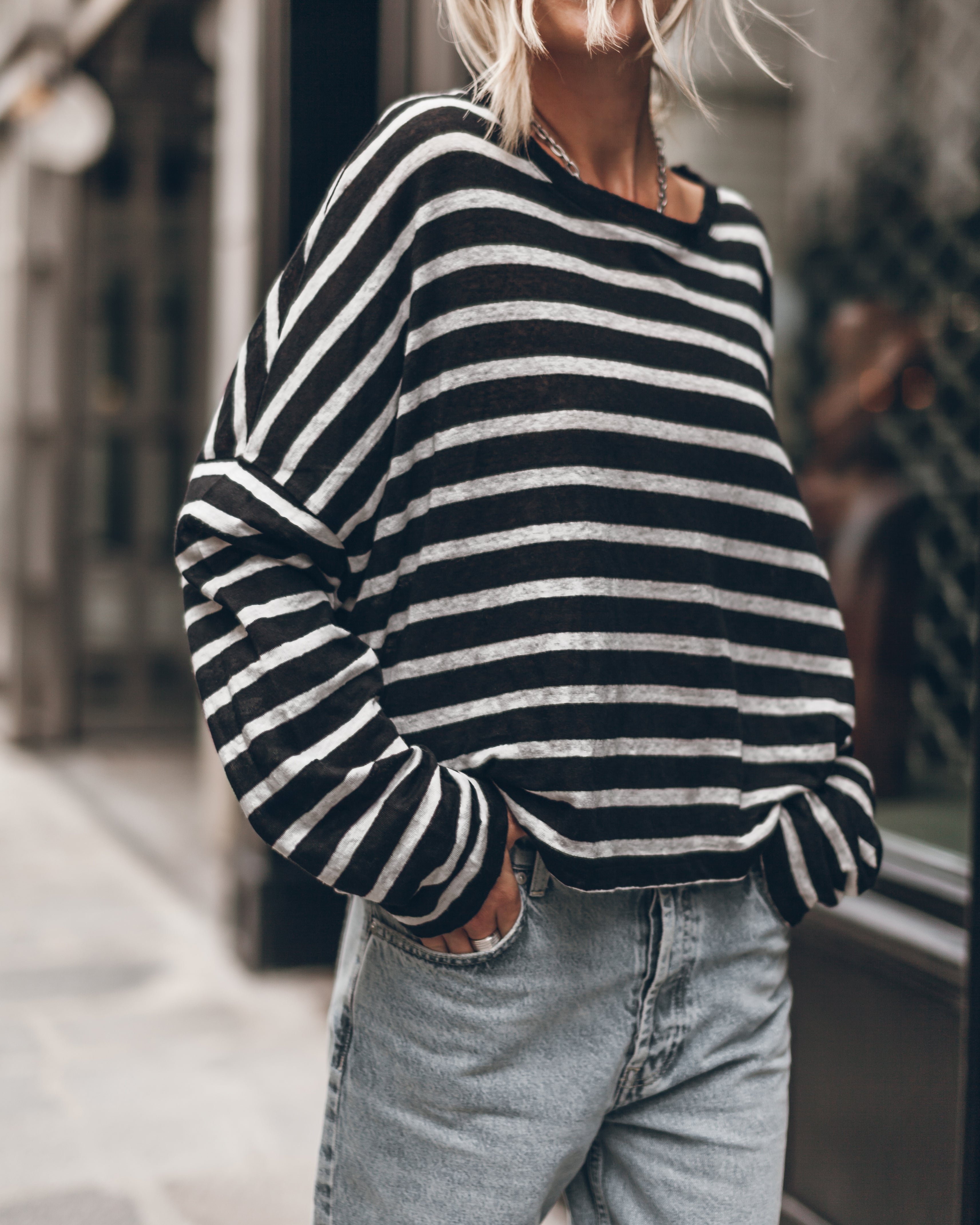 Oversized, schwarz-weiß gestreiftes Leinen-Langarmshirt mit extra langen Ärmeln.
