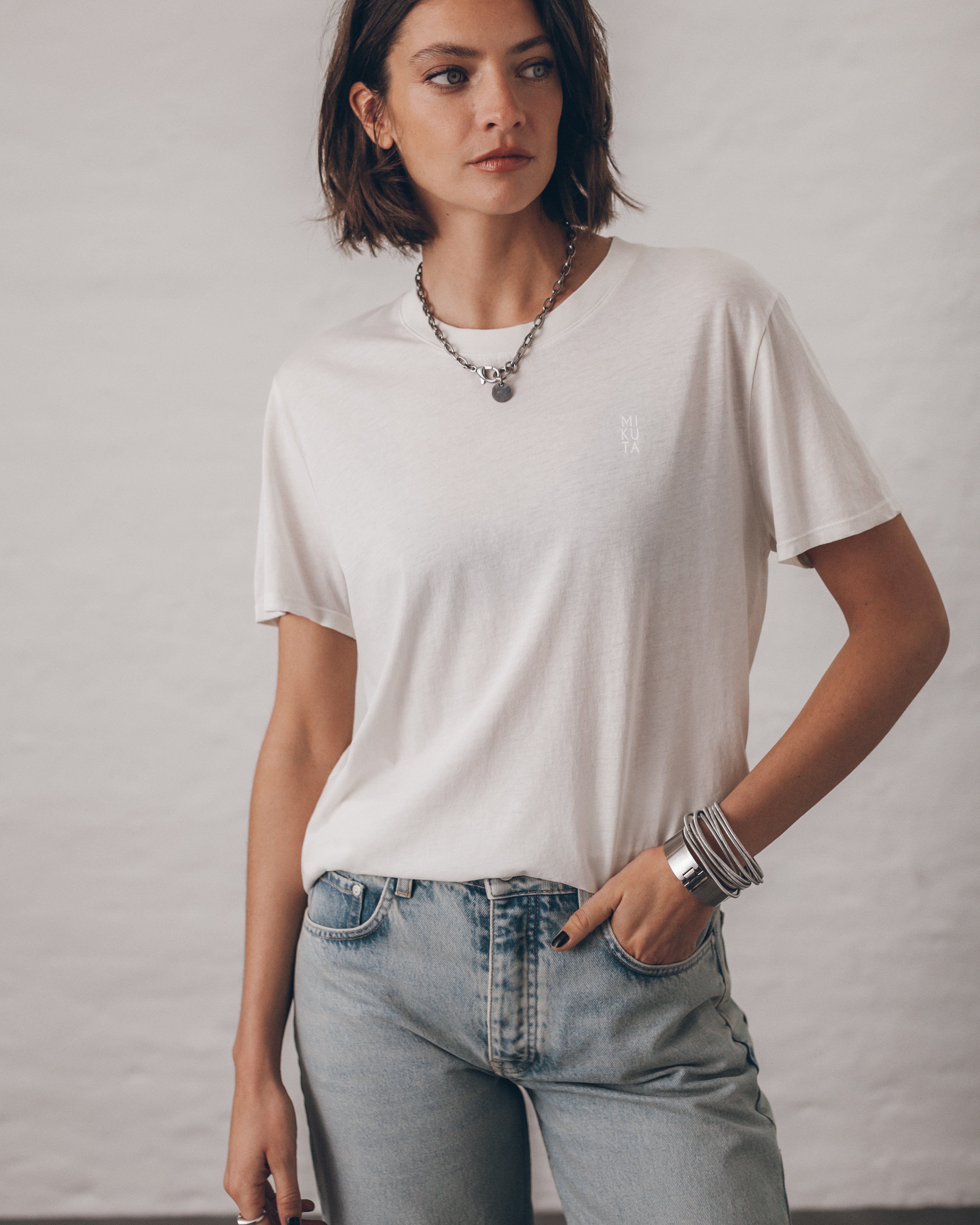 Lässiges und cooles T-Shirt aus Lyocell-Baumwoll-Mix in Off-White mit kleinem MIKUTA-Print auf der Brust. Sehr weich und leicht.
