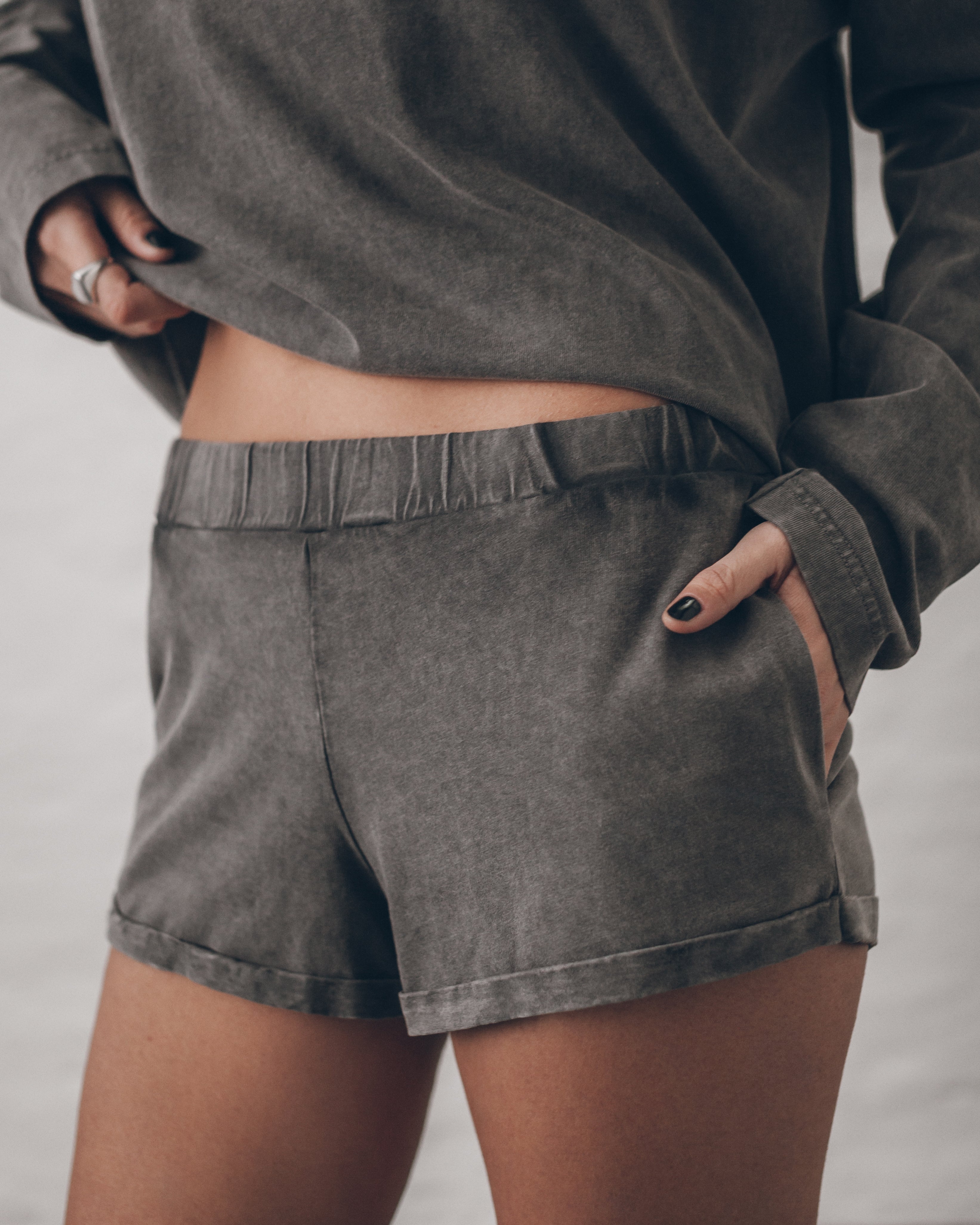 The Dark Faded Cotton Shorts’ thick yet breathable pure cotton fabric is totally opaque, allowing enough coverage and coziness to complement the mini inseam and length. With an elastic waistband, two side pockets and solo back patch pocket - versatile, from sleepwear to beachwear.