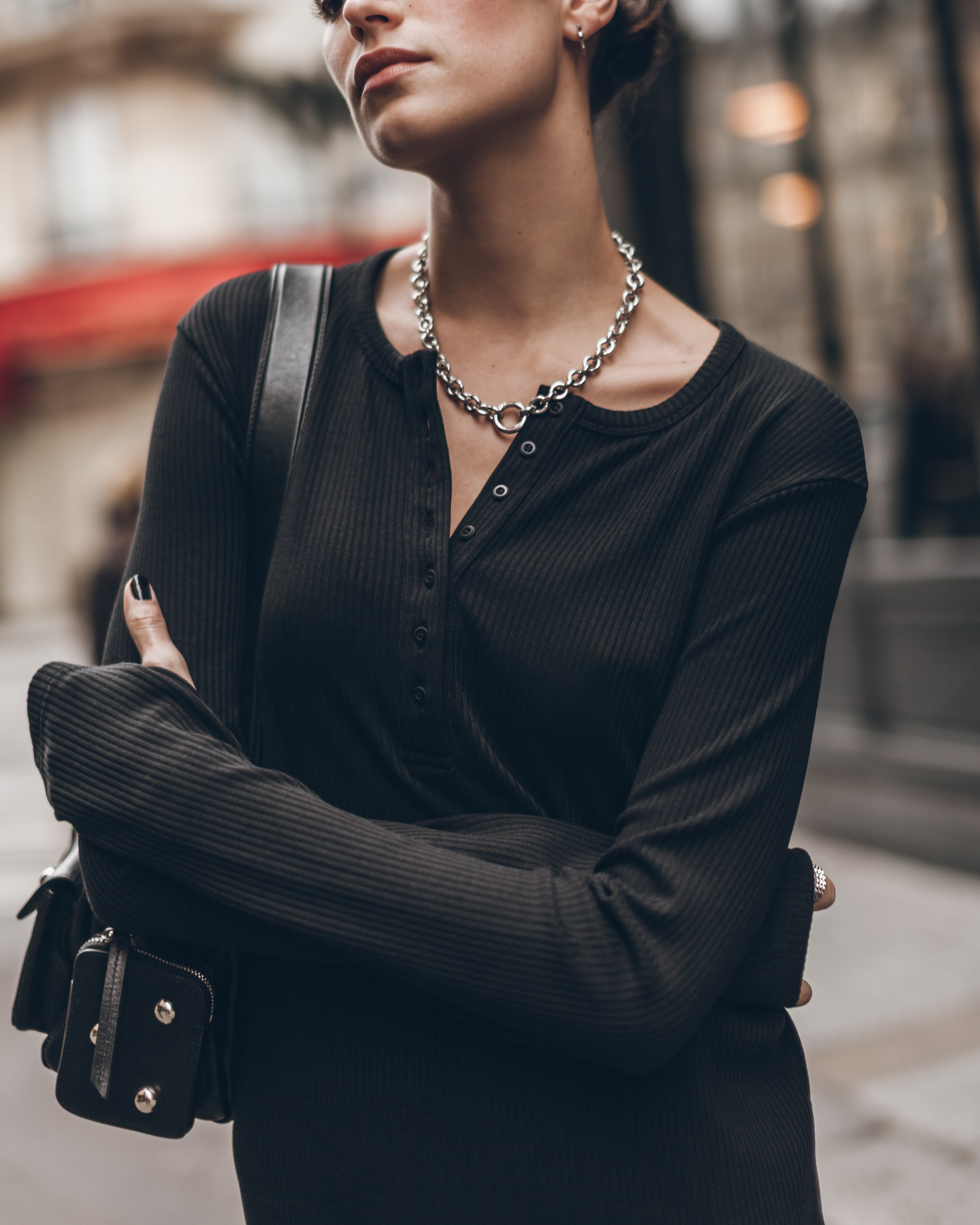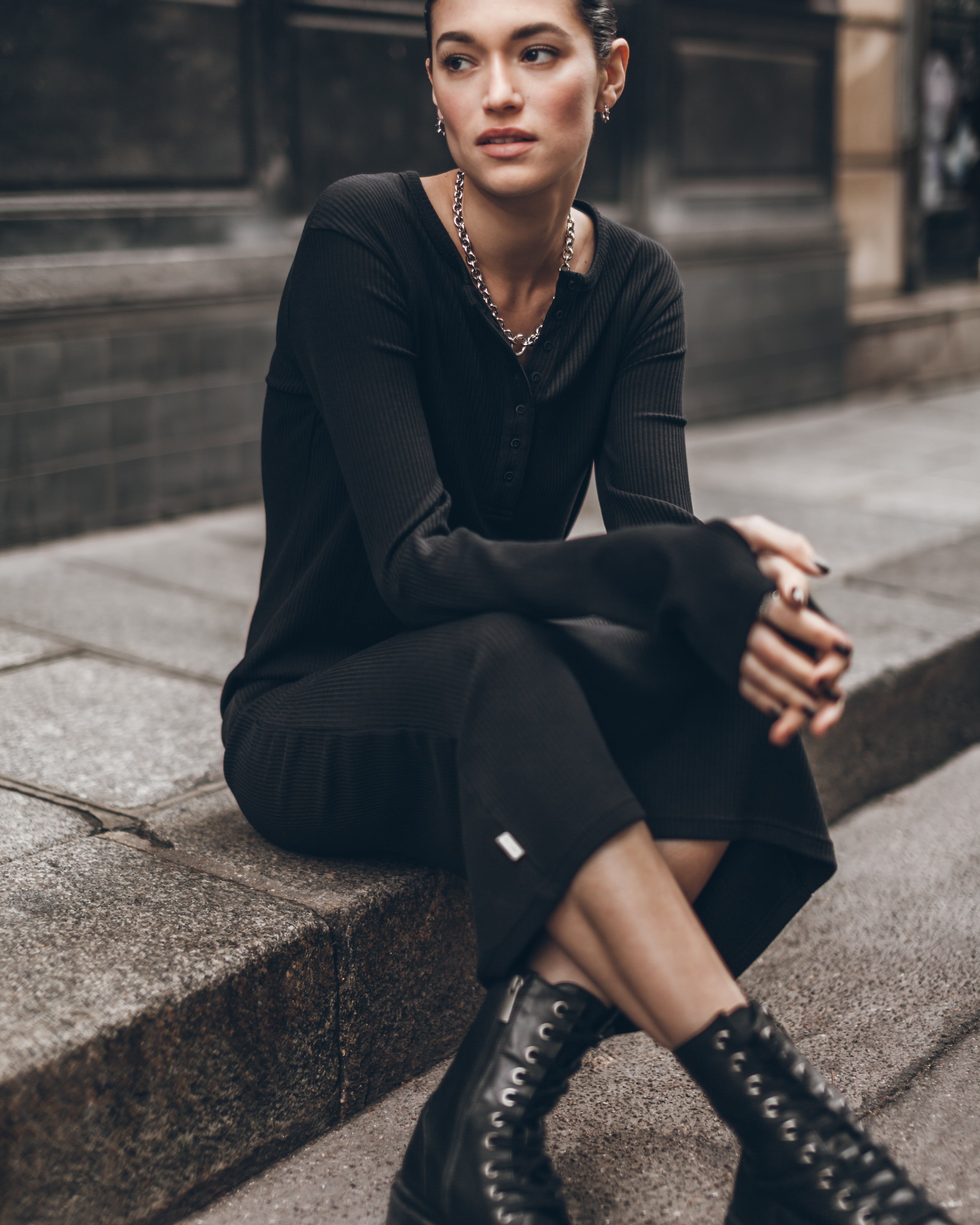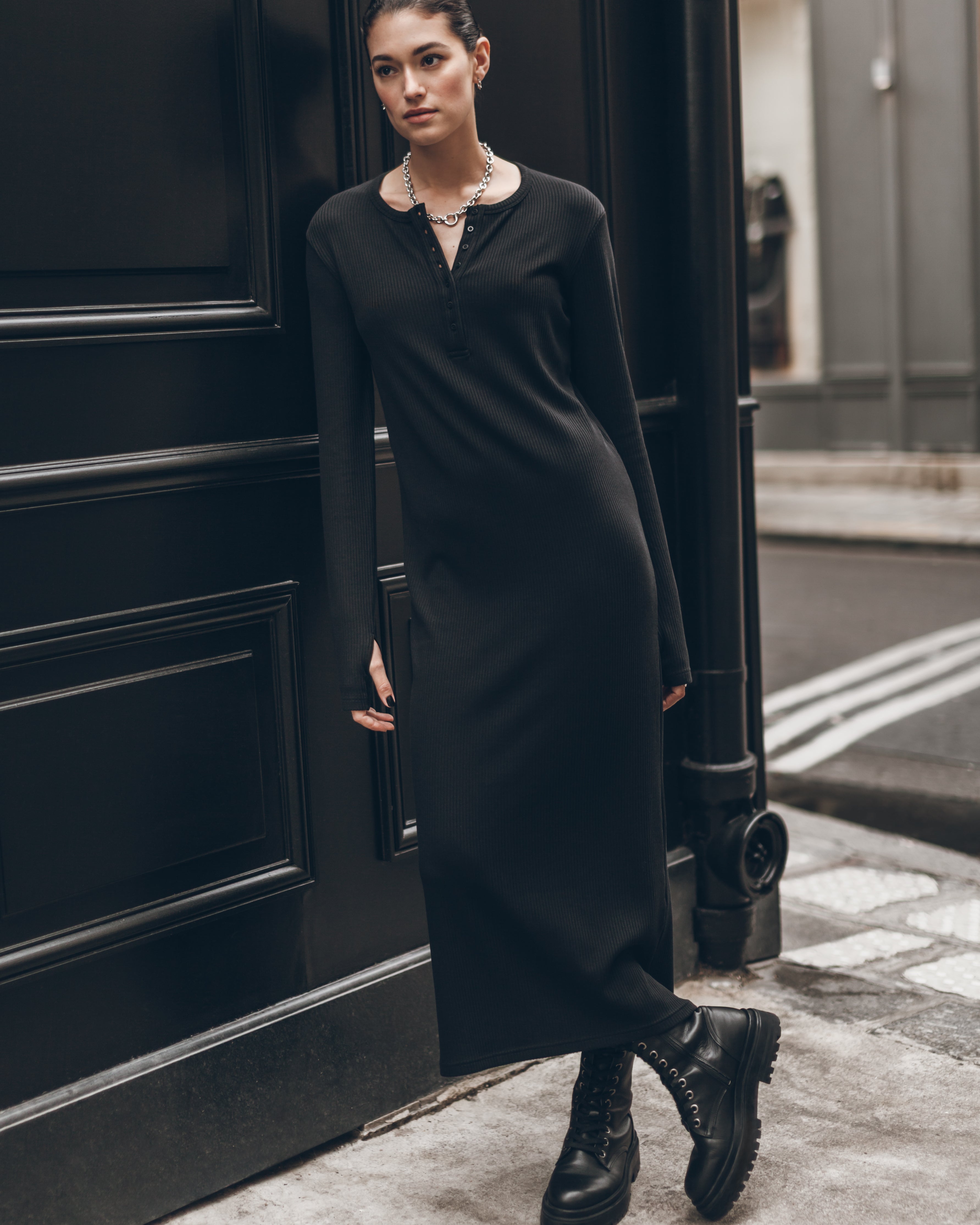 This second skin dress caresses your silhouette without ever clinging too tight, crafted in a feather-soft lyocell-cotton blend with a ribbed texture and comfy elastane stretch. Featuring a dainty five button closure neckline and thumbhole detail.