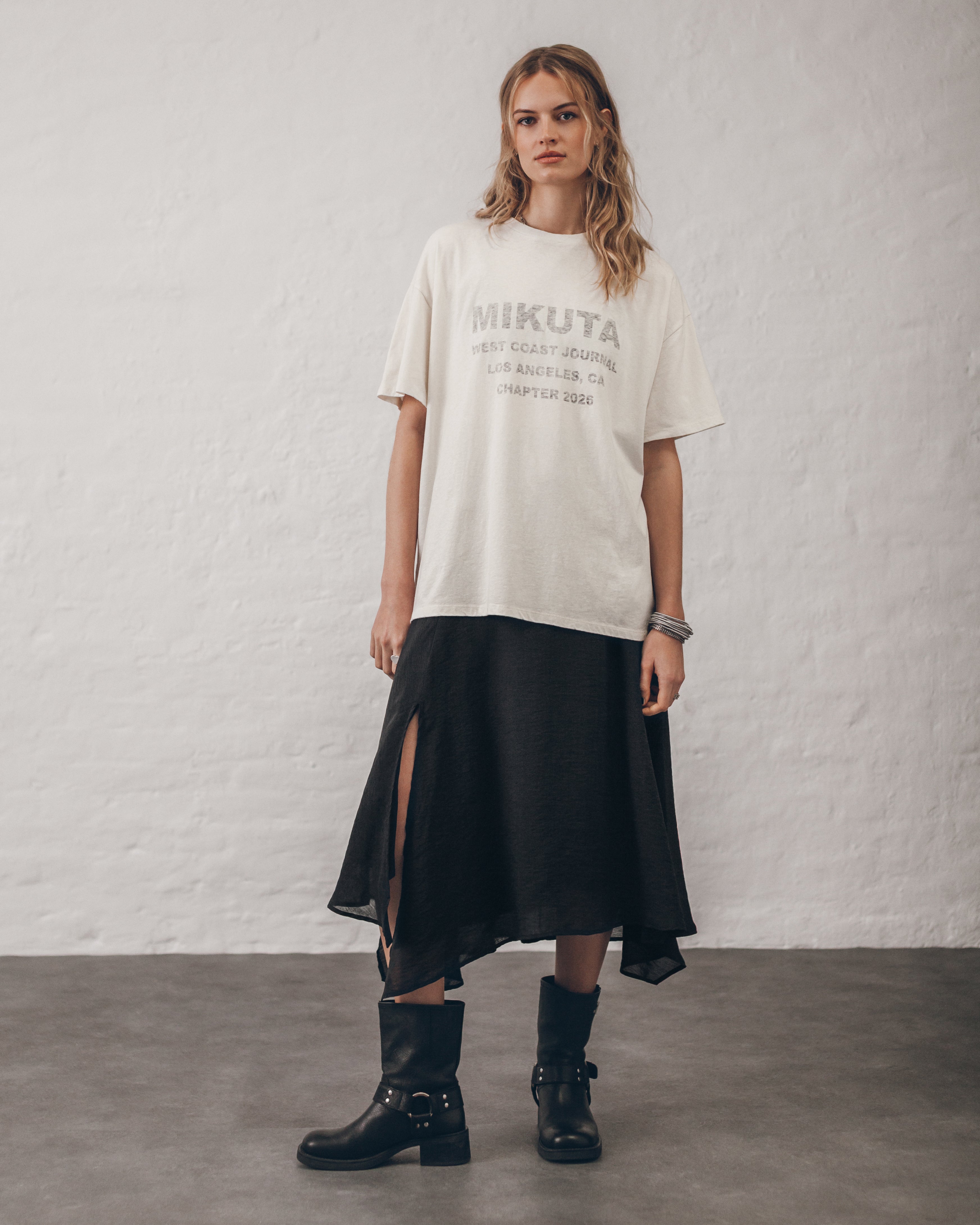 Effortless, fluid, and endlessly versatile. The Black Chill Skirt features a soft drape and asymmetrical hemline that moves with you. Designed to catch light subtly while maintaining a sleek, understated silhouette.