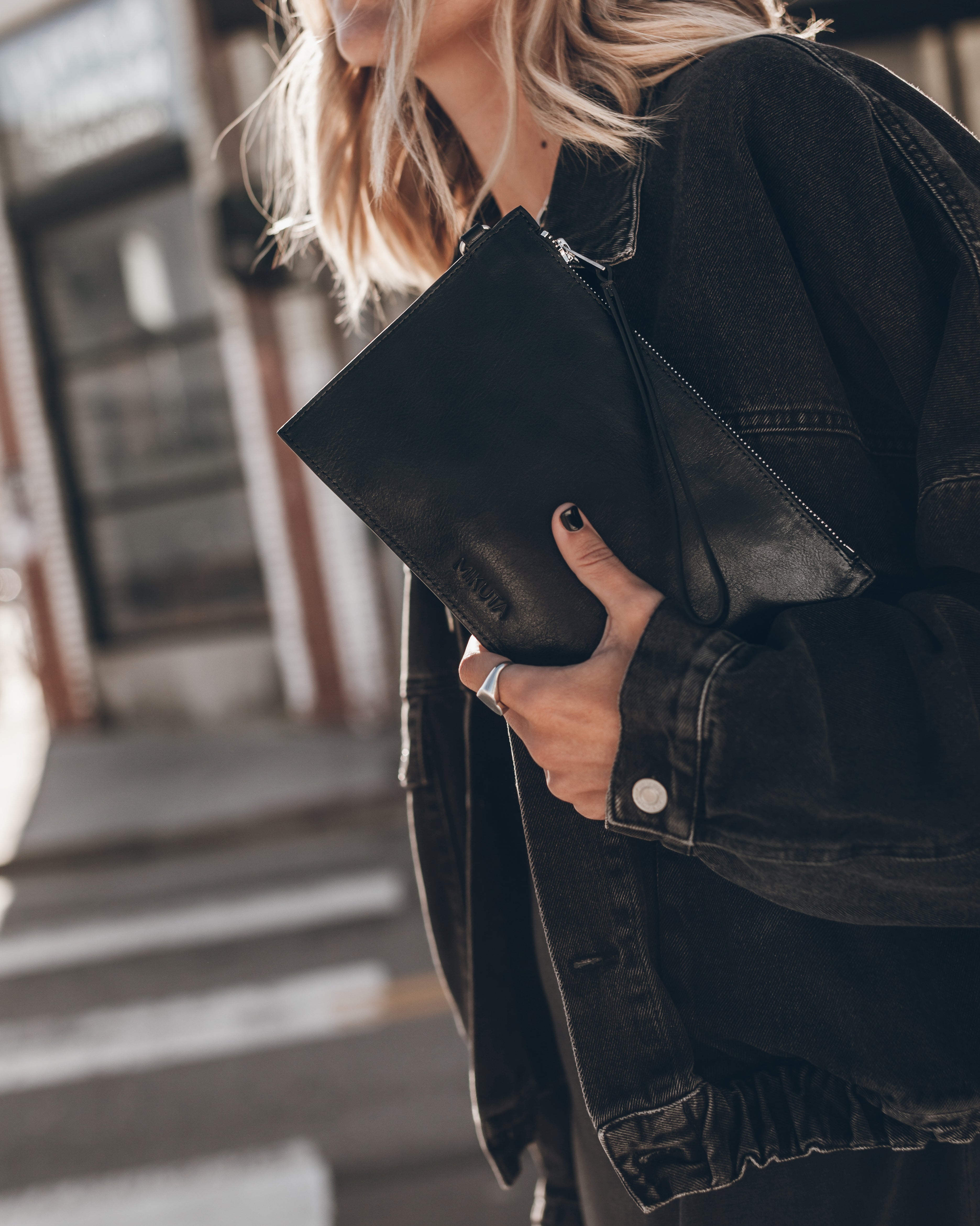 Minimal, refined, and built to last. The Black Leather Pouch is crafted from supple Portuguese leather with a slim silhouette and cotton twill lining. Finished with silver hardware and a leather wrist strap for easy carry.