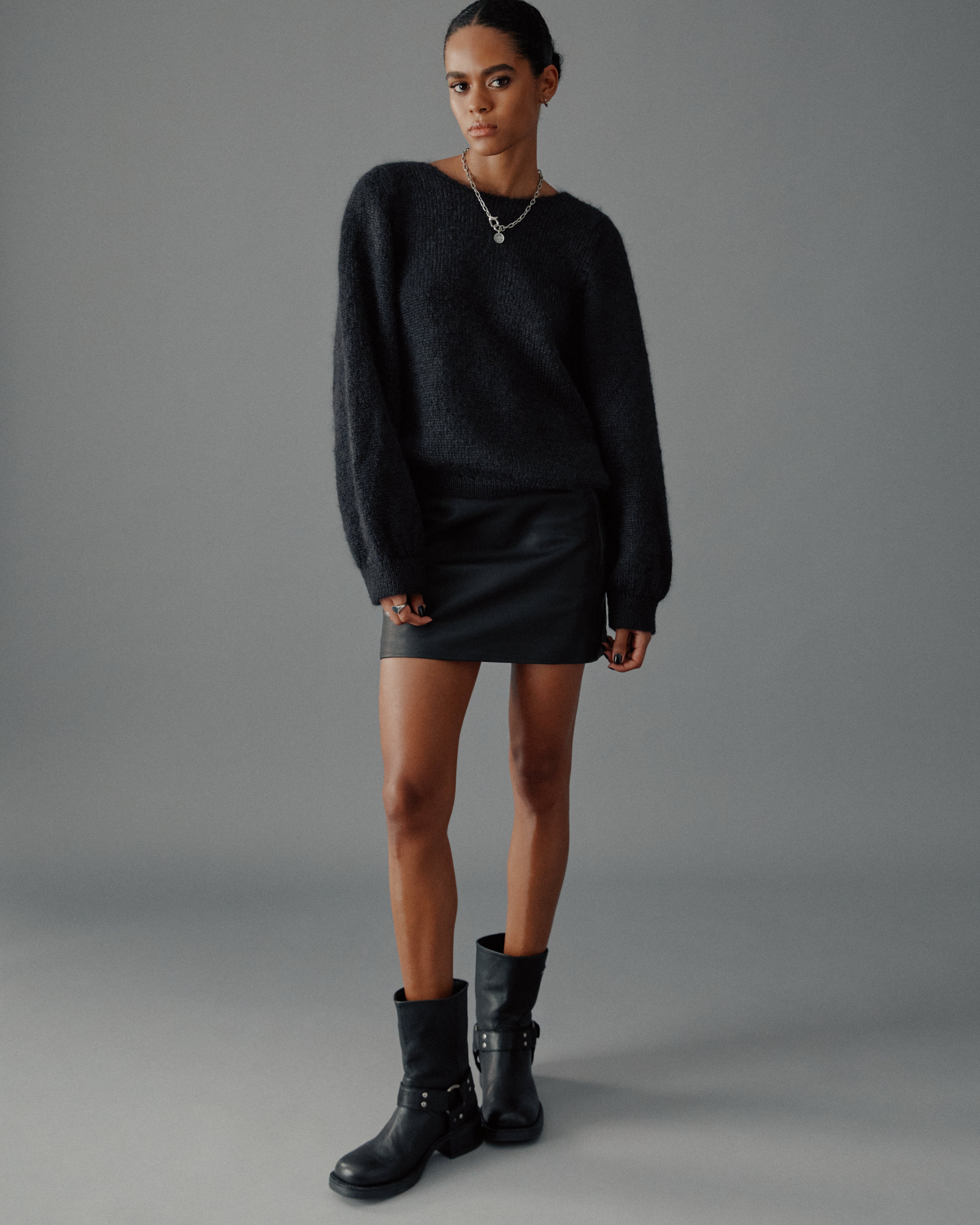 Thick mohair blend sweater with a high neck that runs straight across and an open back. The sweater is fitted with a knot-to-tie closure at the back.
