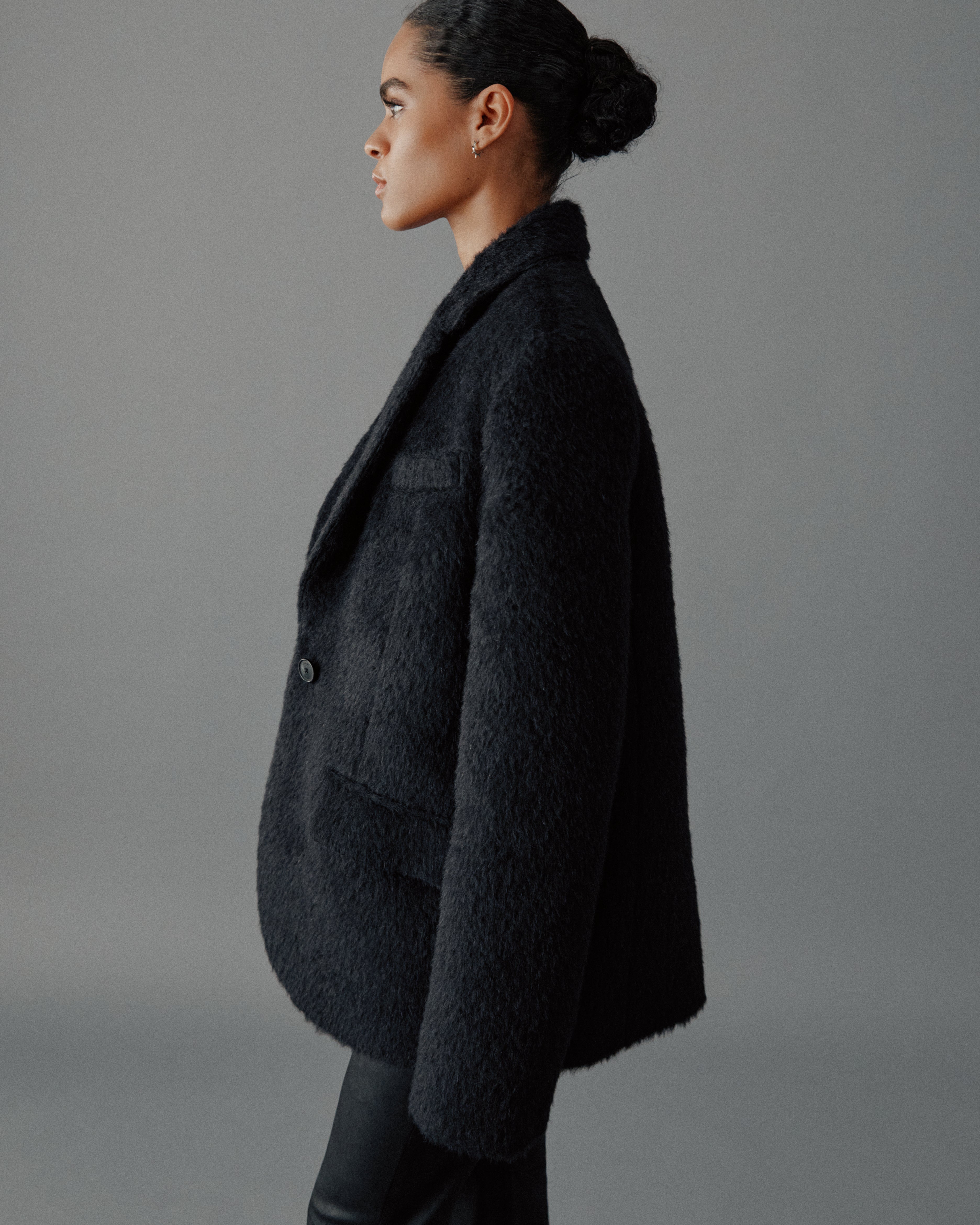 Roomy, oversized blazer tailored our way, with cashmere blend exterior and a single front button for a minimalistic closure. The unique surface texture makes workwear warm and inviting.