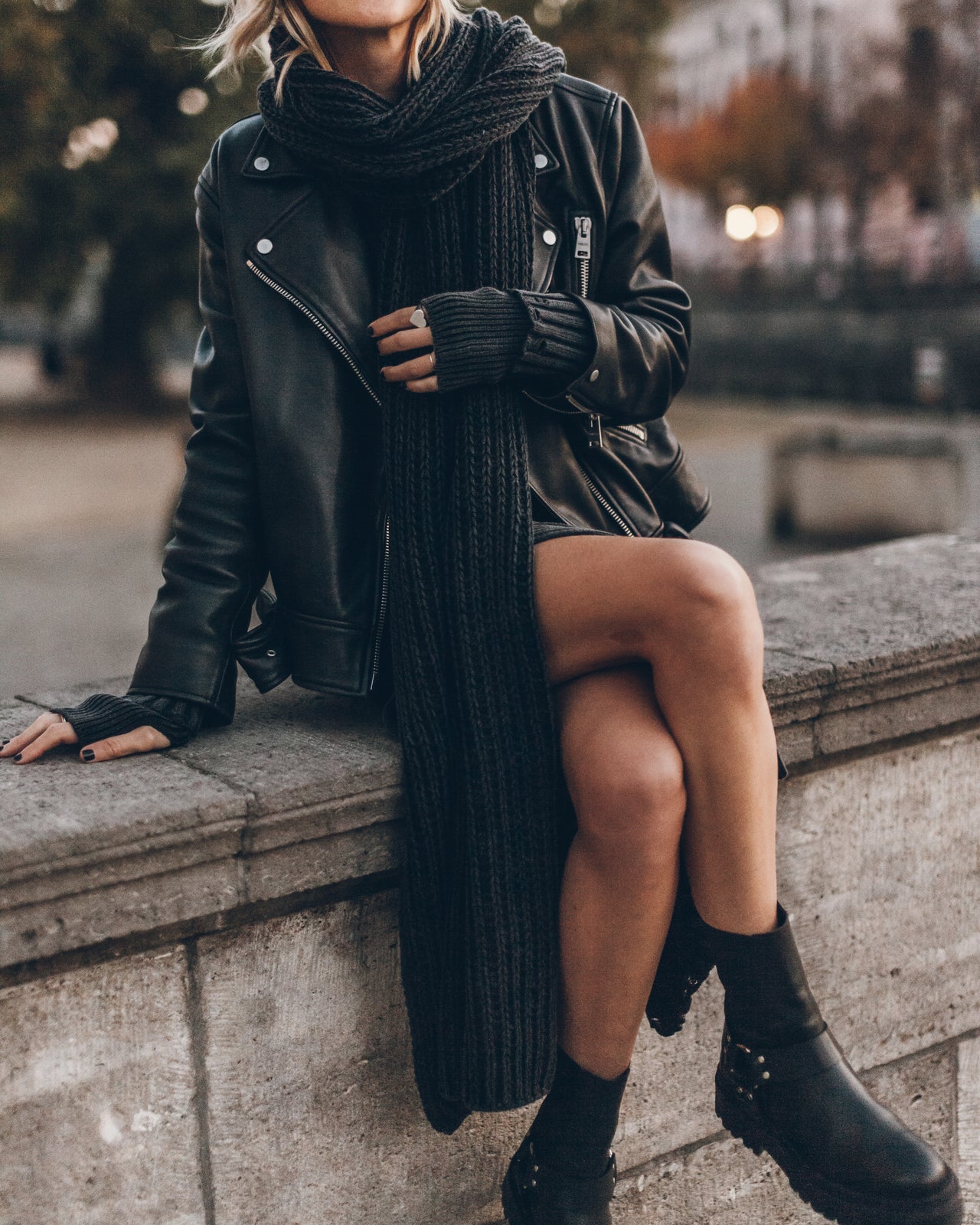 Black faded long ribbed knit dress in cotton with long sleeves, a slit on the side and destroyed details on the hems.