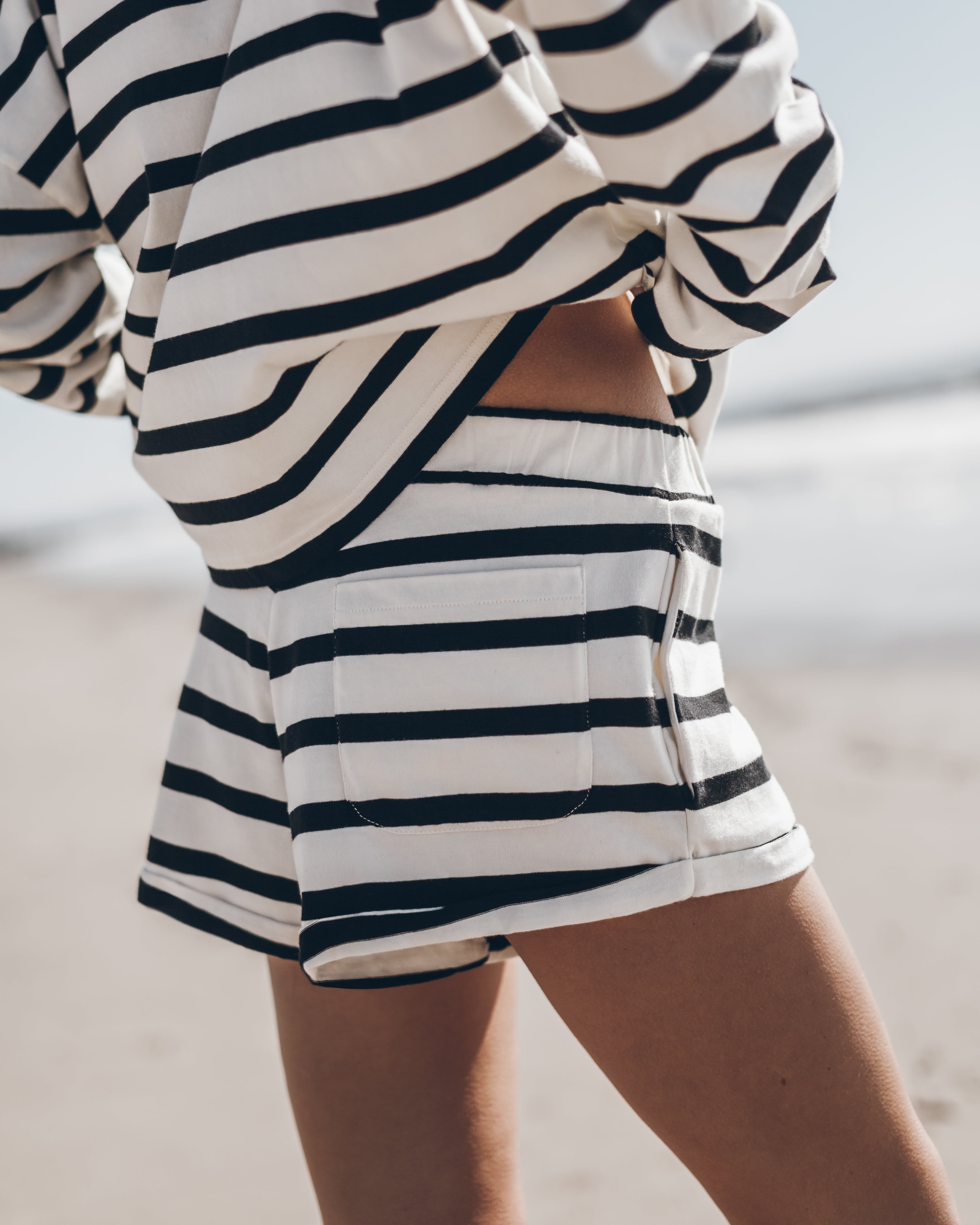 The Striped Cotton Shorts’ thick yet breathable pure cotton fabric is totally opaque, allowing enough coverage and coziness to complement the mini inseam and length. With an elastic waistband, two side pockets and solo back patch pocket, these classic black and white stripes are versatile, from sleepwear to beachwear.