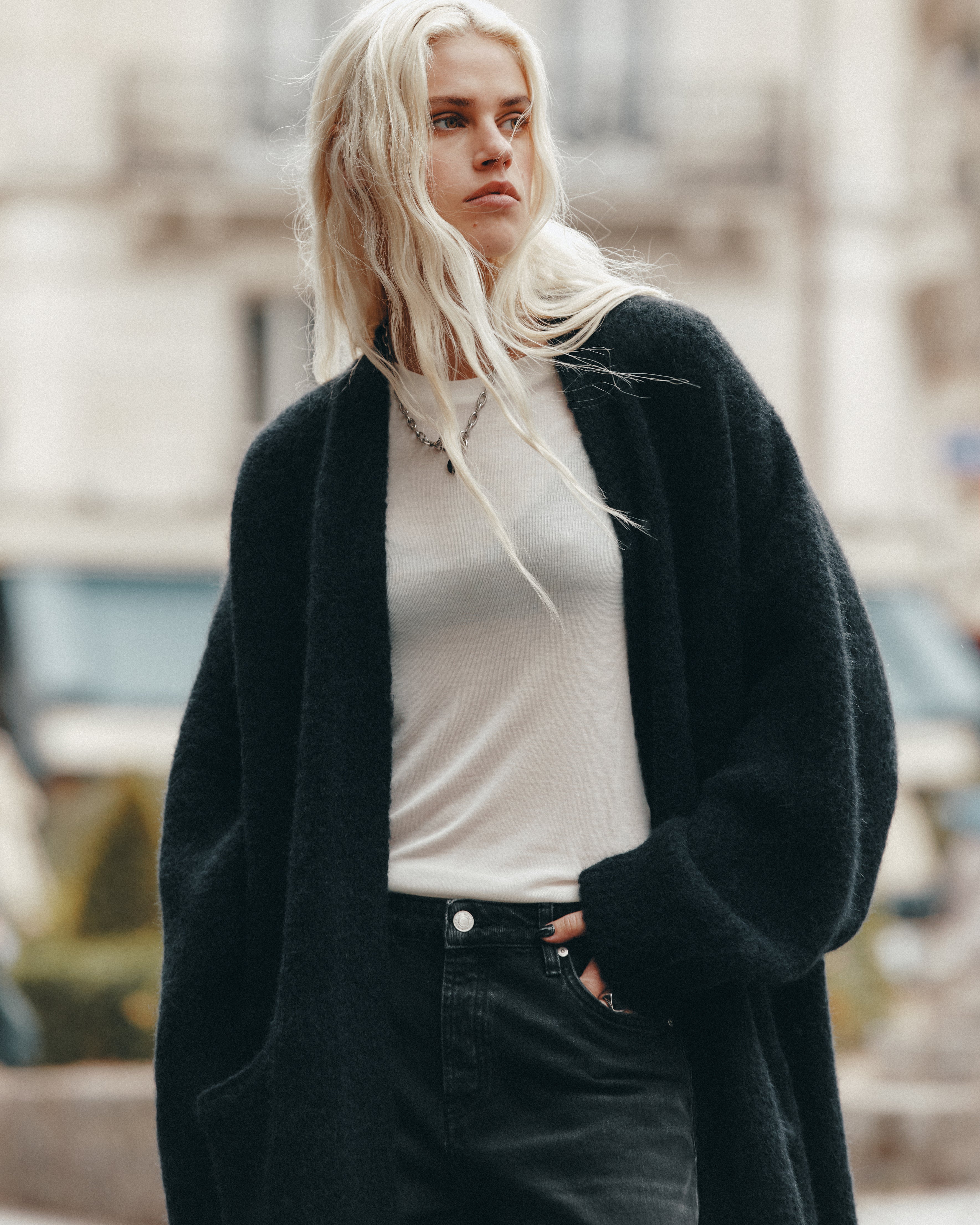 Ultra long comfort cardigan with deep side pockets, crafted in Portugal from a thick alpaca wool blend with slight elastane stretch.