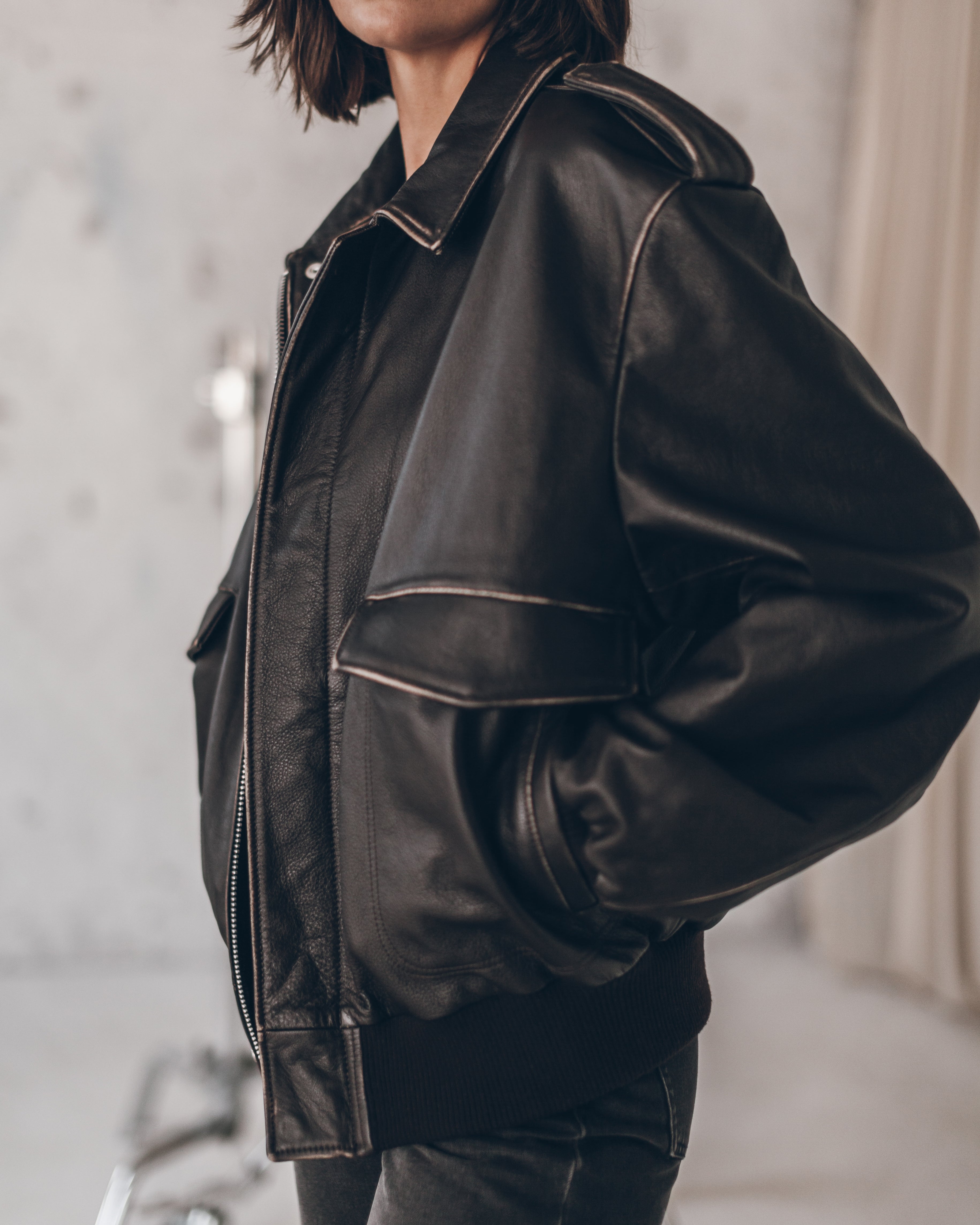 A timeless piece that ages with grace. This oversized, vintage-style jacket is crafted in chrome-free supple leather and features a snap button closure, roomy side pockets, and cuffs and a hem finished with finely ribbed fabric.