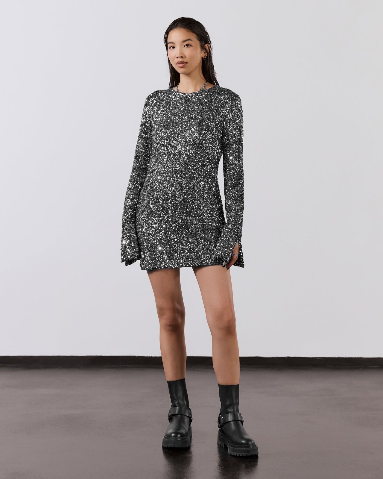 Dark silver sequin dress with open back and extra long sleeves with slits.