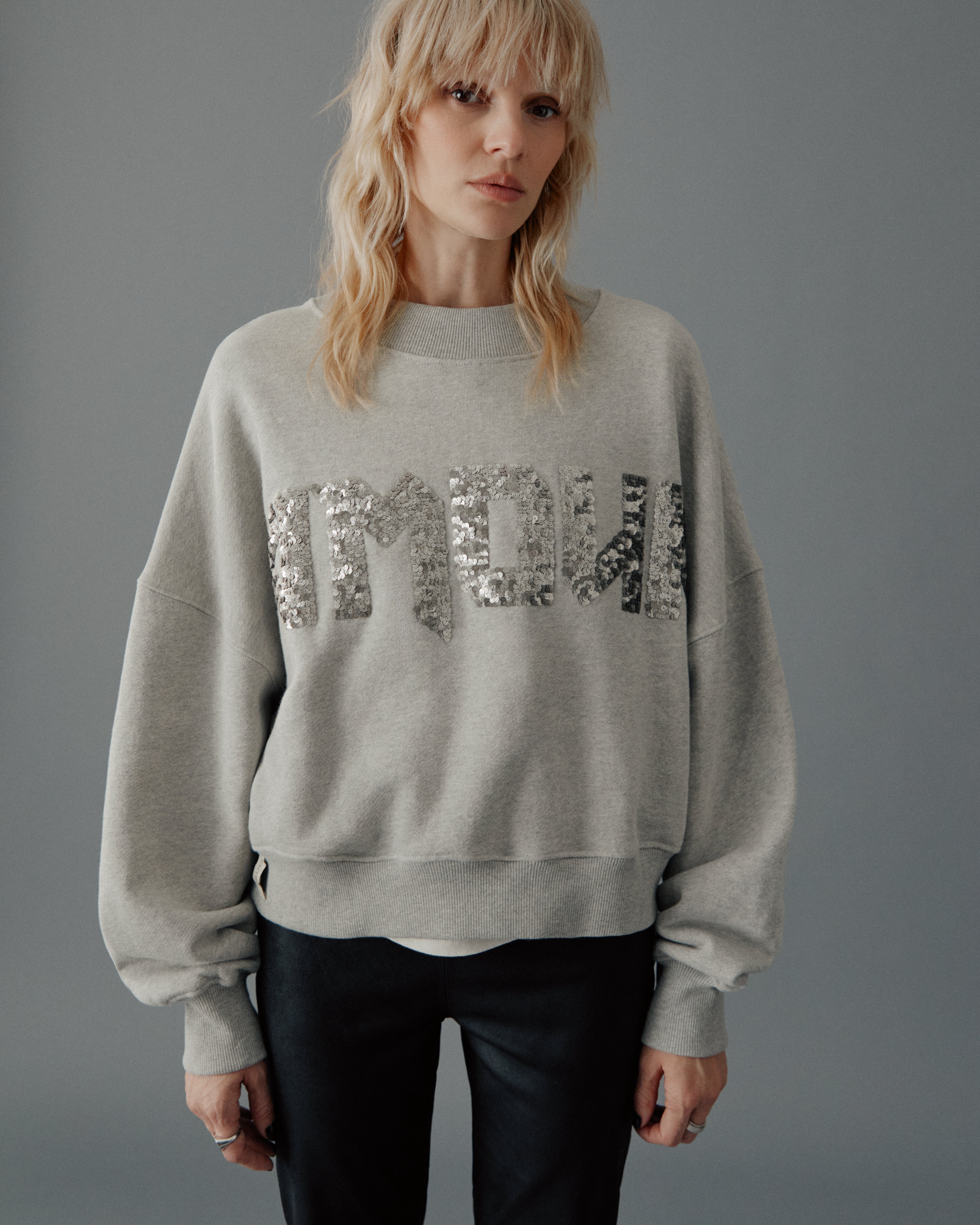 Relaxed sweater in grey melange with AMOUR embroidered in silver sequins on the chest.