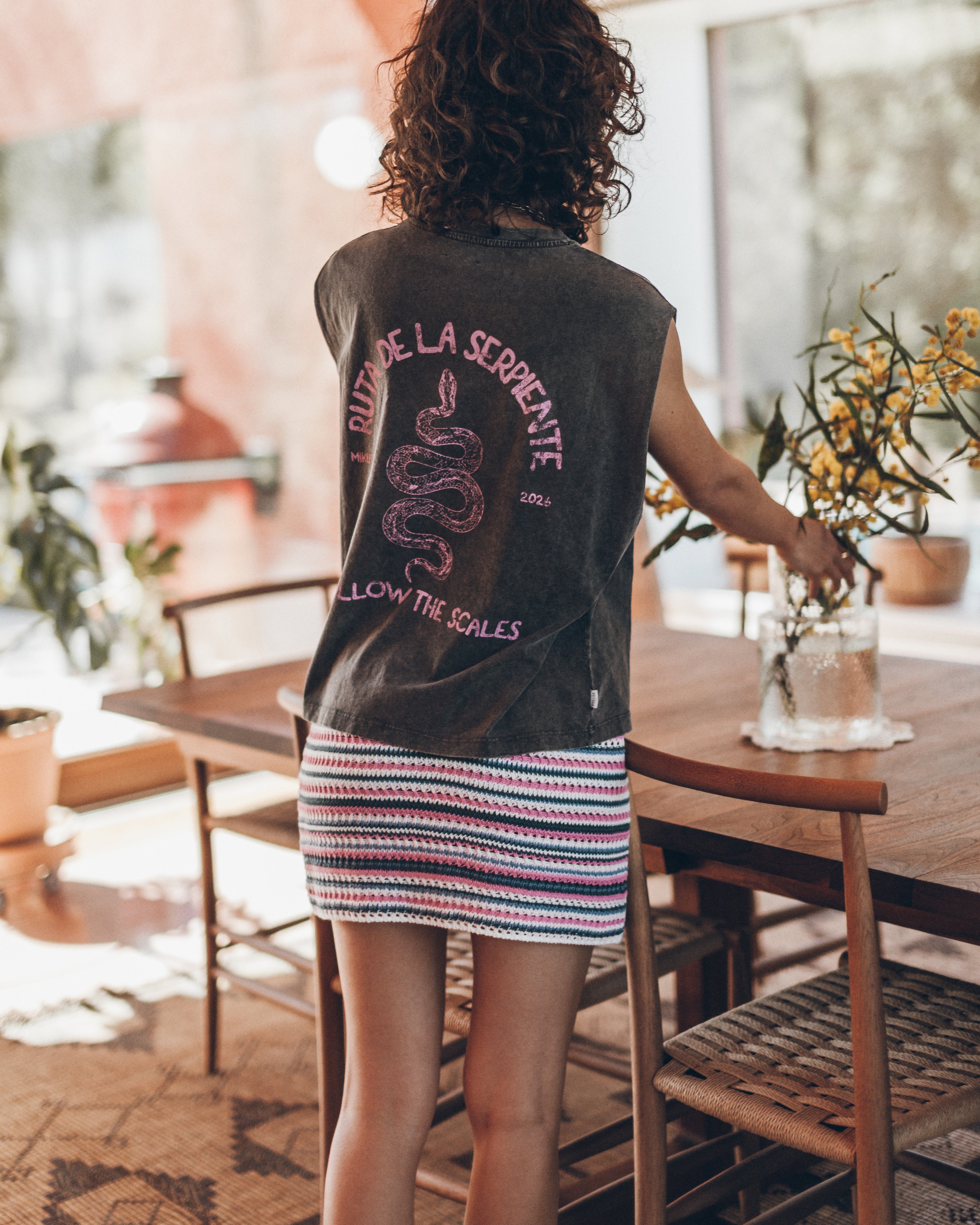 Brought to life due to our founders love of crochet, The Knitted Mini Skirt is knitted using a similar technique to Jacqueline's hand knitted pieces she wears just for herself, and is inspired by the vivid multicolored surroundings of Mexico City.