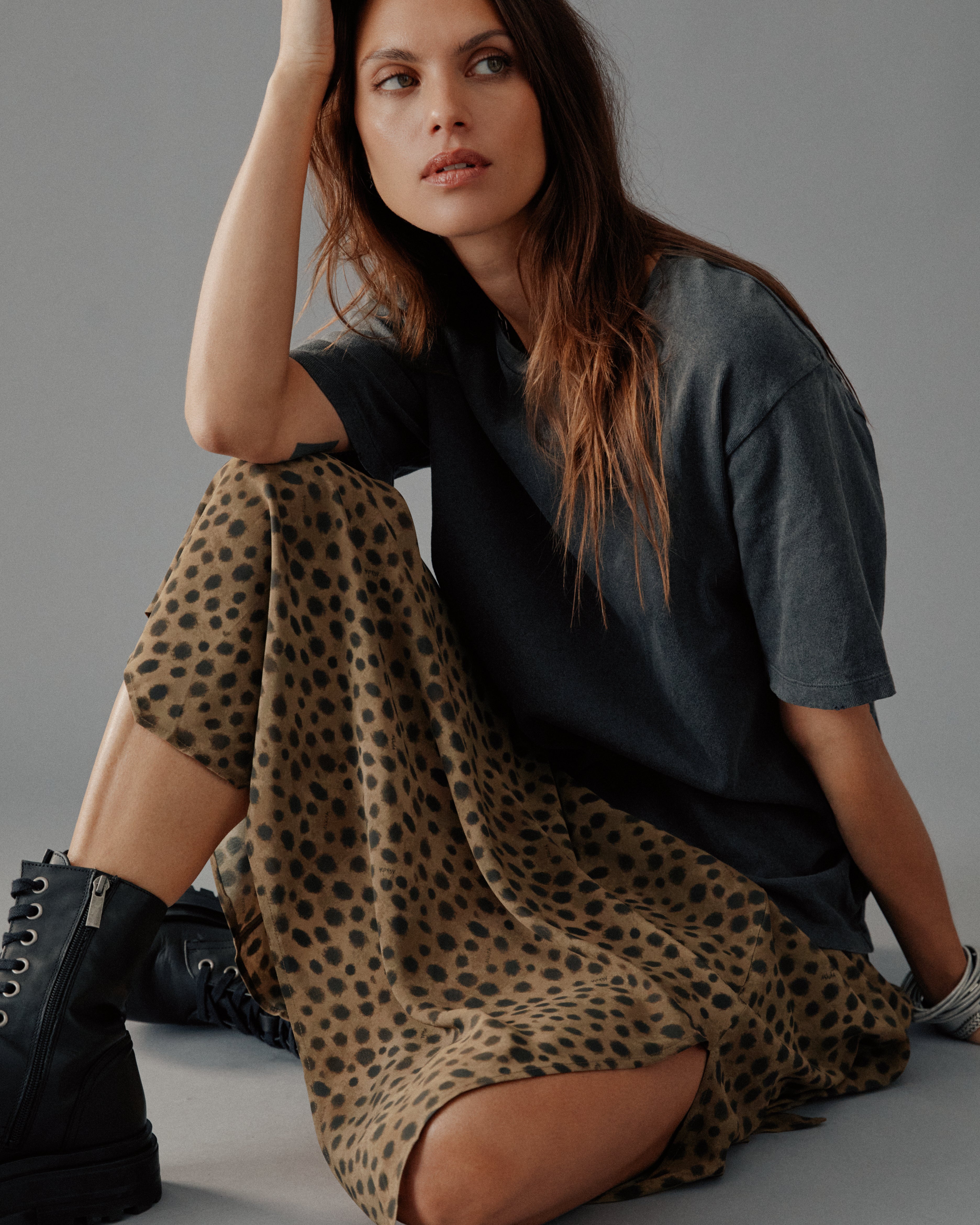 Our in-house custom Leo pattern is digitally printed and echoes through the Fall25 collection. The Leo Chill Skirt is accented with an