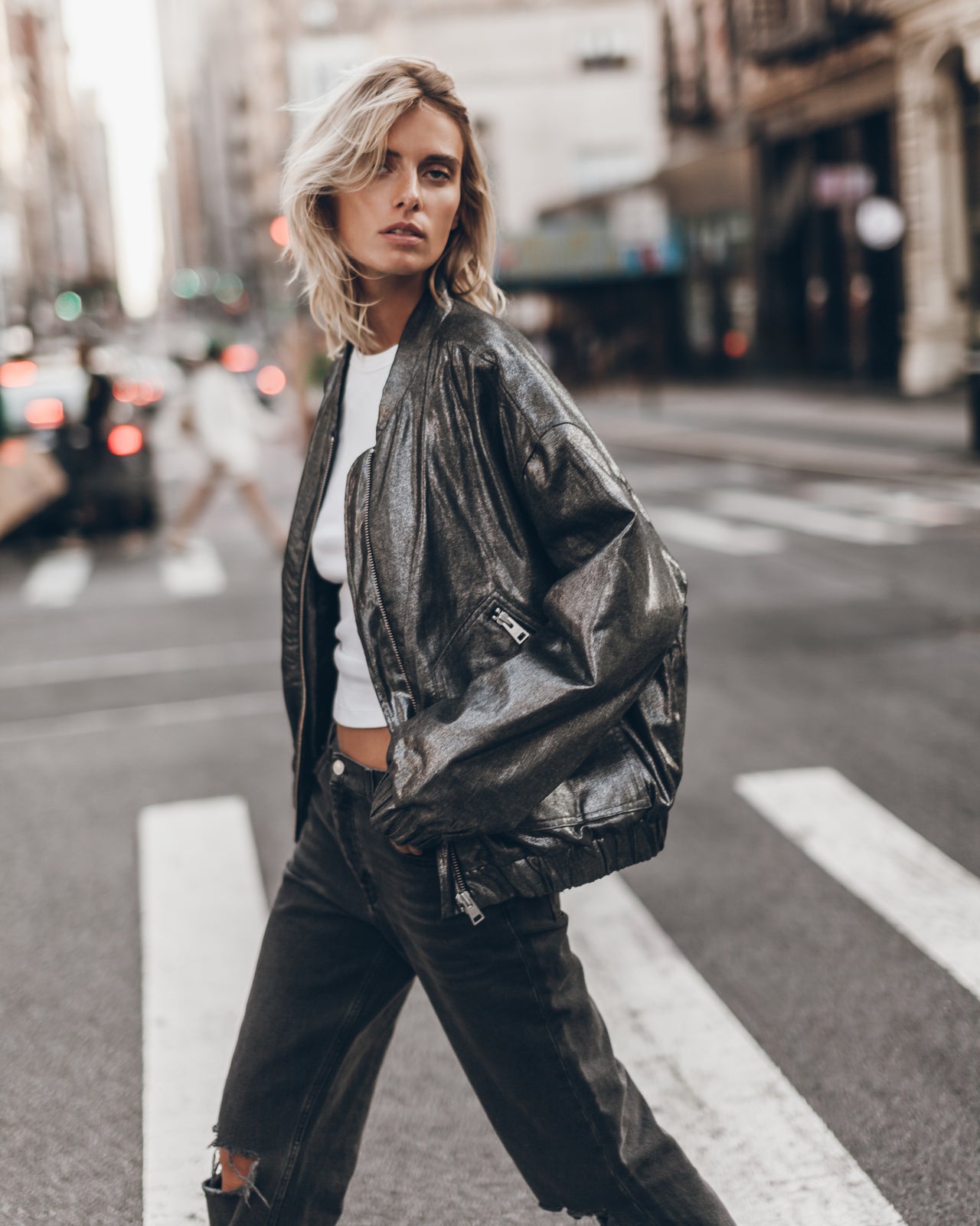 Relaxed zipped bomber jacket in shimmery silver. The jacket has two zipper pockets on the front and two hidden pockets on the sides.